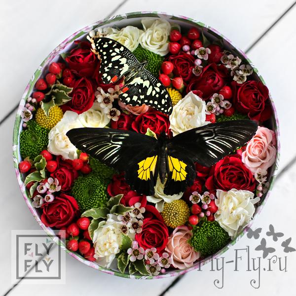 Яркая и страстная цветочная композиция несомненно привлечет к себе внимание и подчеркнет красоту тропических бабочек! Цветы находятся во флористической губке и будут радовать не меньше недели. Бабочки в стоимость не включены.