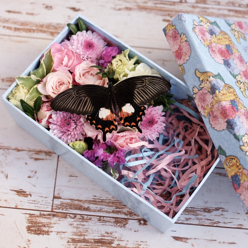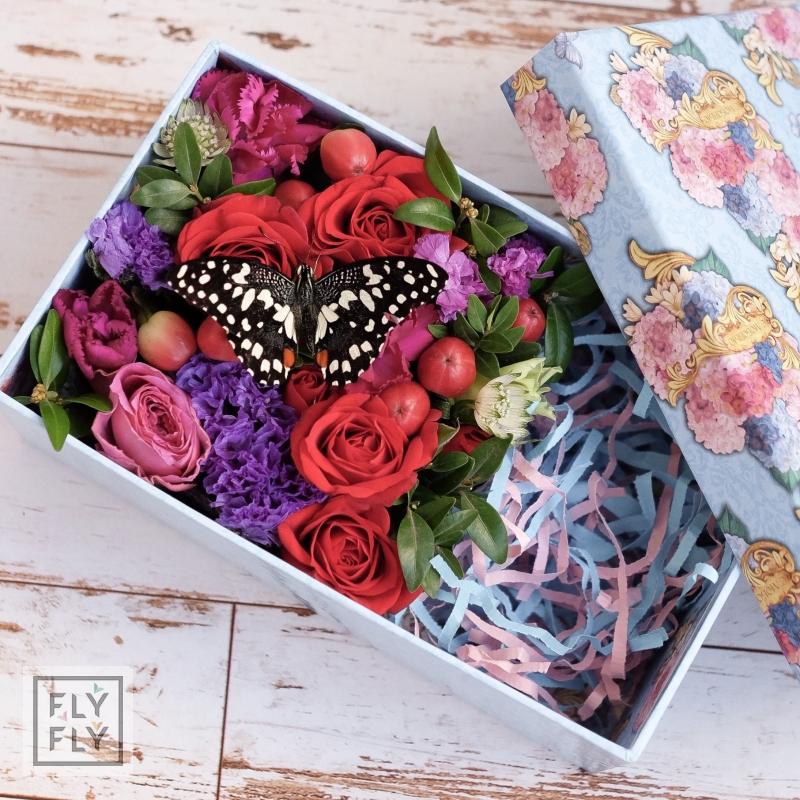 Милейшая коробочка-комплимент с цветами и бабочкой. Специальная цена к празднику! (без учета доставки) Цветы находятся во флористической губке. Коробочка может быть круглой, квадратной или в форме сердца. Бабочку можно заменить на пирожные.