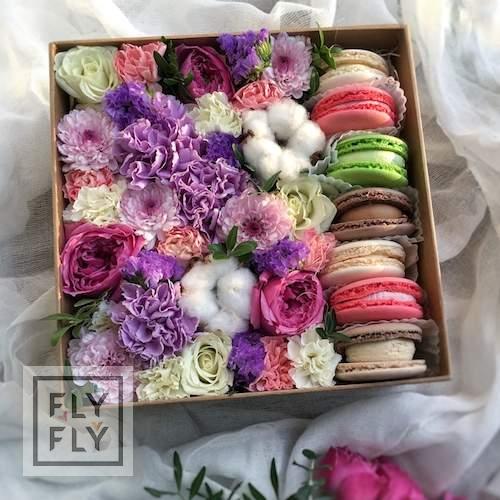 Коробочка с цветами в красивейшей лавандовой гамме и вкуснейшими пирожными макарони, которые буквально тают во рту. В составе удивительные лавандовые гвоздики и пионовидные розочки. Композиция находится во флористической губке, и будет радовать получателя не меньше недели.