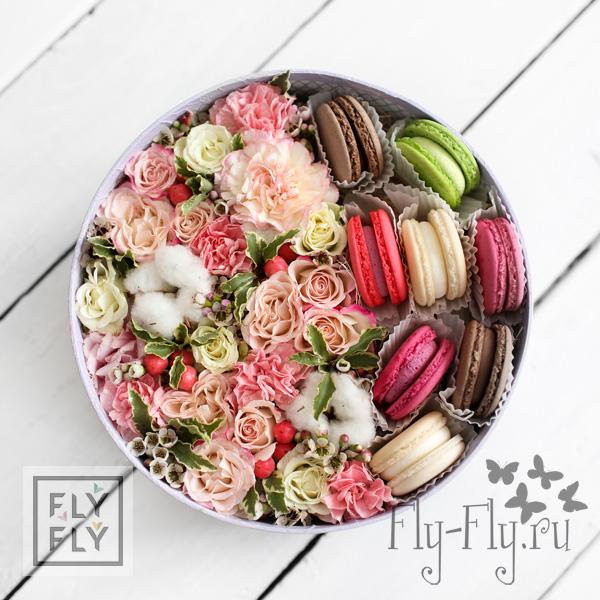 Словно шарики клубничного и сливочного мороженого перемешались в этой воздушной и удивительно вкусной коробочке. Цветы находятся во флористической губке и будут радовать не меньше недели. А вкус нежных пирожных запомнится вам надолго.